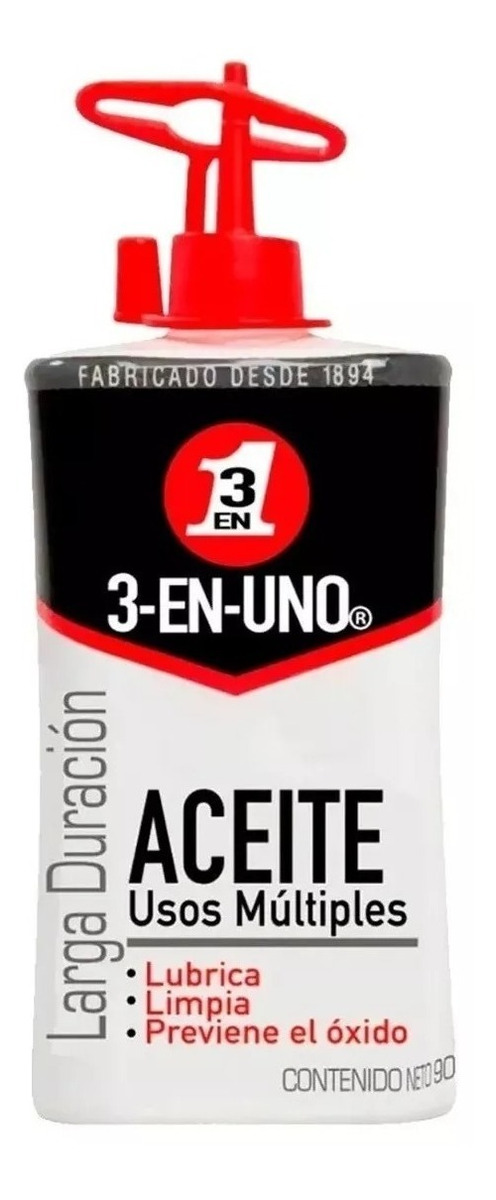 El aceite multiusos 3-EN-UNO es un excelente limpiador de objetos metálicos y suciedad, además de un gran lubricante para todo tipo de piezas facilitando su movimiento y eliminando toda clase de ruidos o chirridos.