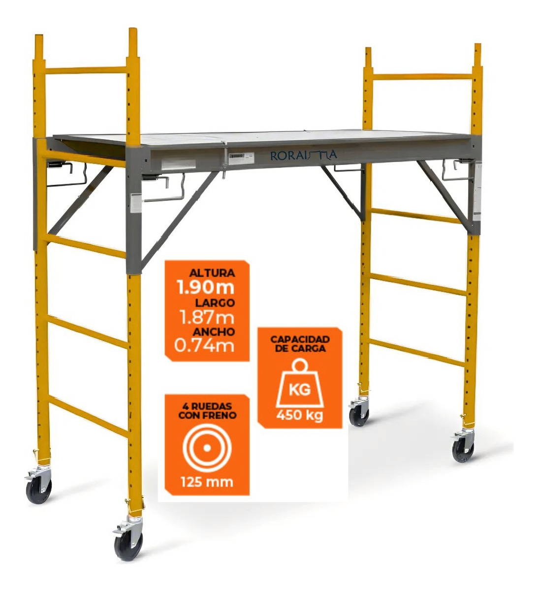 Una de sus principales ventajas es el armado fácil y práctico. No requiere herramientas adicionales, lo que facilita montar y desmontar rápidamente la estructura sin complicaciones. Además, el andamio está equipado con ruedas provistas de frenos de seguridad, lo que permite desplazarlo sin esfuerzo y fijarlo de manera estable en el lugar de trabajo. Las ruedas deben mantenerse siempre bloqueadas cuando el usuario se encuentre sobre la plataforma o cuando se esté ascendiendo. El movimiento del andamio solo debe realizarse cuando no haya personas arriba, evitando riesgos de vuelco o pérdida de equilibrio.