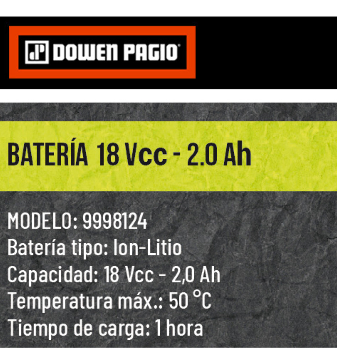 La baterĂa Dowen Pagio 18V de 2.0Ah es un repuesto original diseñado exclusivamente para la lĂnea de herramientas inalĂ¡mbricas 18V de la marca. Fabricada con tecnologĂa de ion de litio, esta baterĂa ofrece una excelente autonomĂa, sin efecto memoria, lo que permite recargarla en cualquier momento sin afectar su vida Ăºtil.