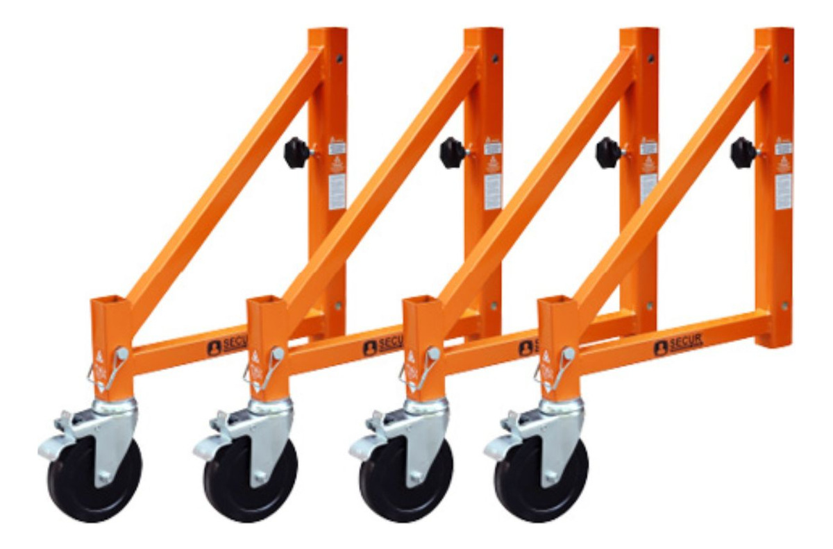 La estructura del andamio permite el apilado de dos unidades de altura, y para ello el uso de estabilizadores es indispensable. Este combo incluye el set completo requerido para asegurar la estabilidad cuando se apilan dos módulos. Los estabilizadores se instalan en cada pata del andamio y deben ajustarse utilizando los pasadores de seguridad y las perillas roscadas para garantizar que queden firmemente alineados y en contacto constante con el piso. Cuando se apilan dos andamios, se requieren cuatro estabilizadores instalados correctamente para mantener el conjunto firme y evitar cualquier riesgo de vuelco.