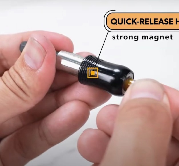 – Soporte de liberación rápida de 1/4 pulgadas x 65 mm, con un fuerte imán que mantiene las puntas en su lugar y facilita un acceso rápido y cómodo.