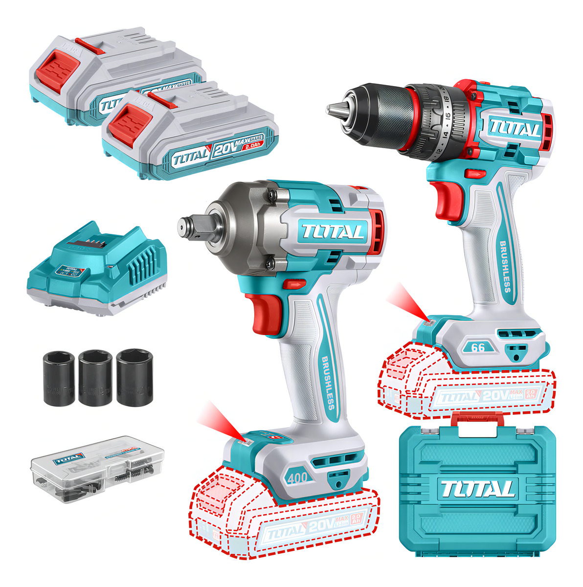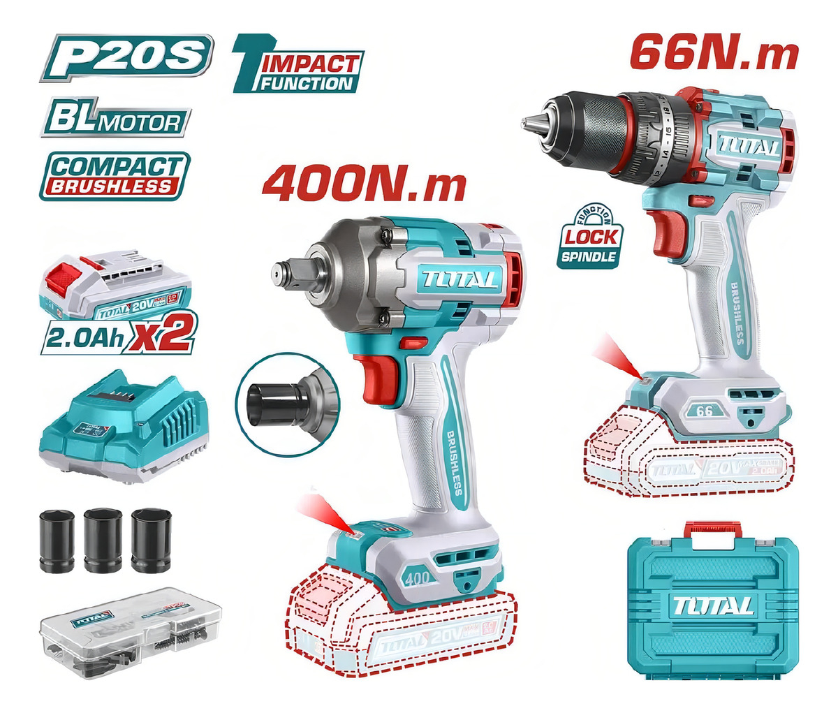 Kit Inalámbrico Total Sin Carbones : Llave Impacto 1/2» 400nm + Atornillador Con Percutor 66nm – Con 2 Baterías 2.0ah Litio-ion, Cargador, Maletín, Dados Y Punta – Tckli20275