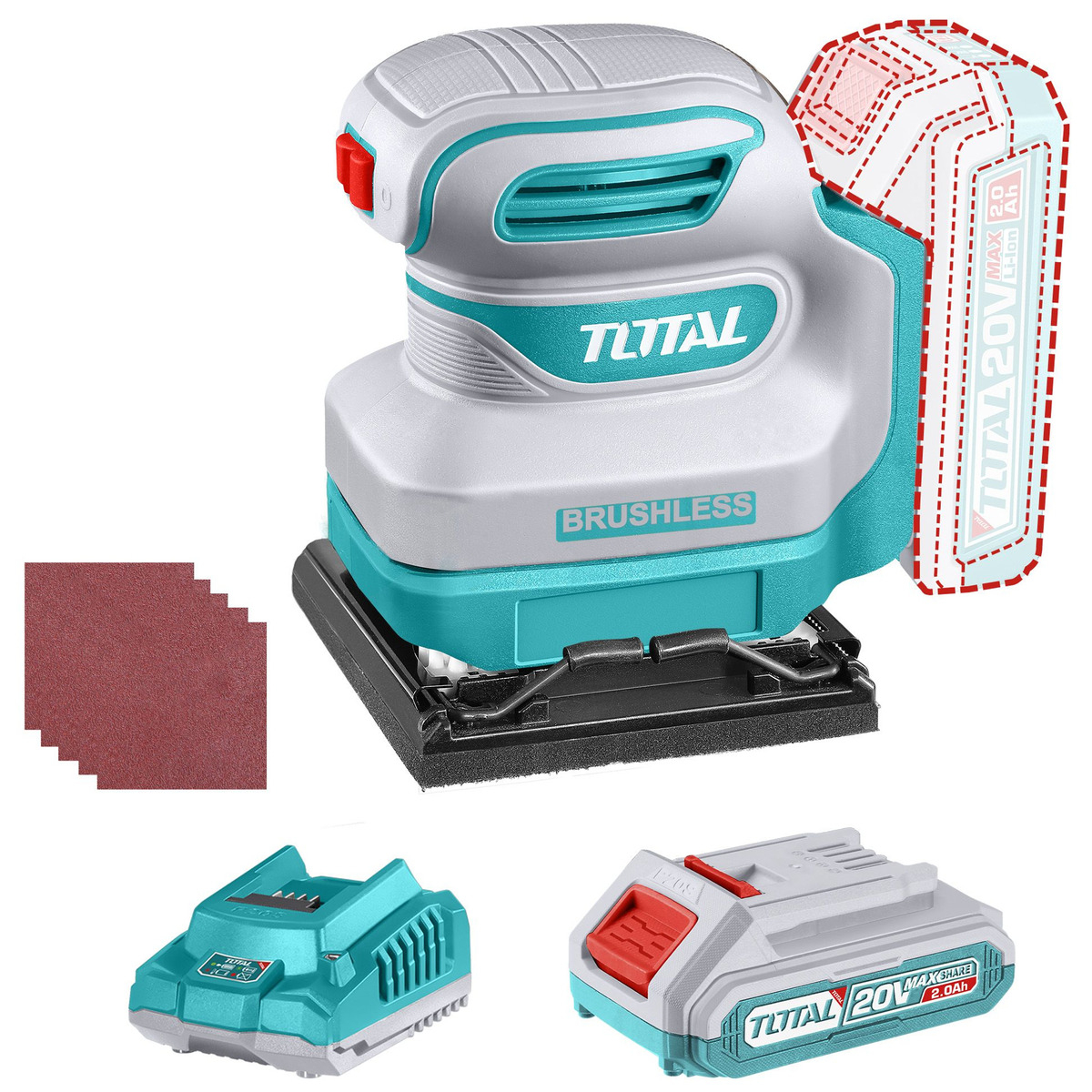Incluye una baterĂa de 2.0Ah, cargador rĂ¡pido y 5 hojas de lija.