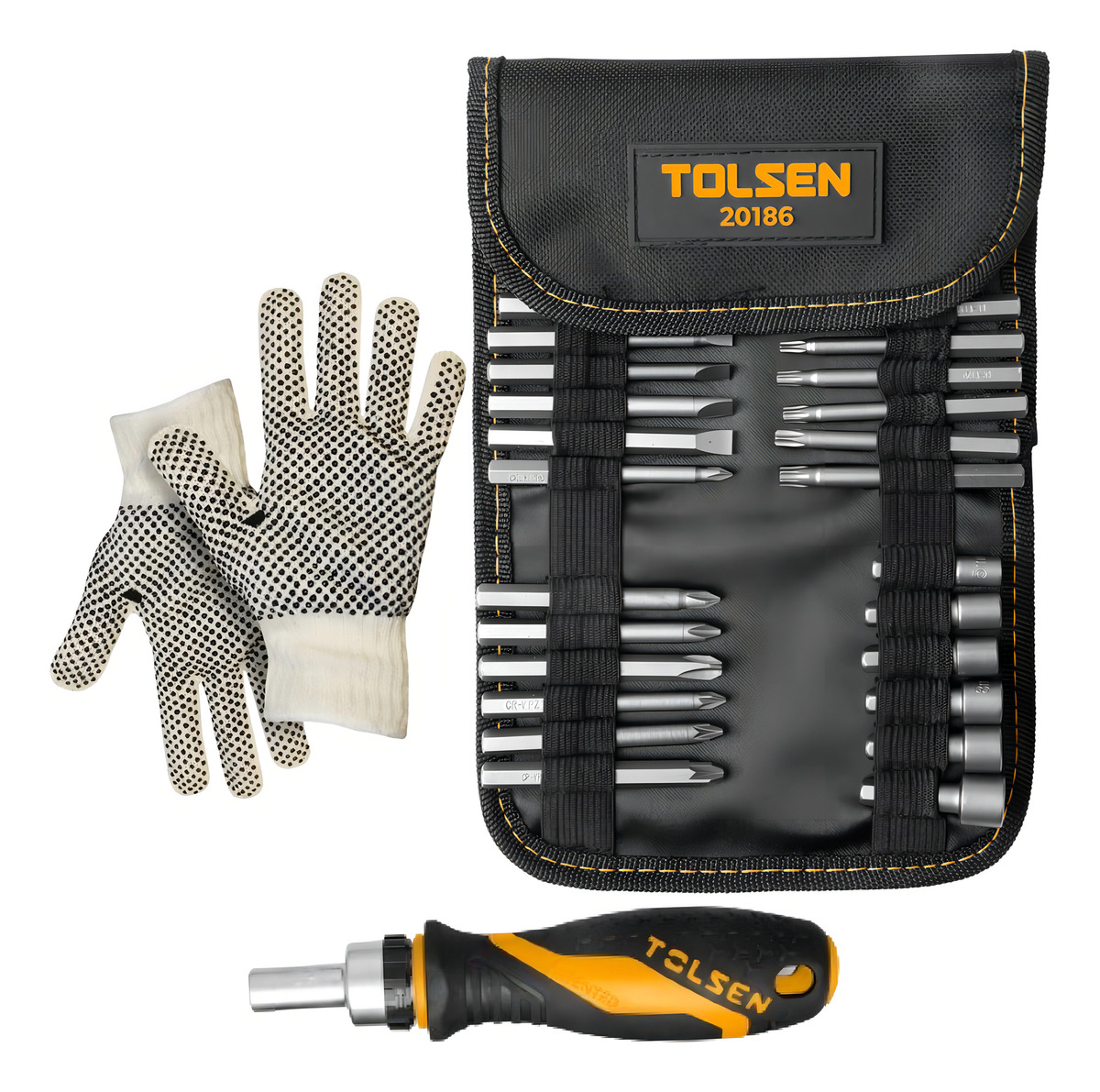 El set de puntas de destornillador Tolsen de 26 piezas es una solución completa para tus necesidades de atornillado, ofreciendo calidad y versatilidad en una sola caja. El set incluye: