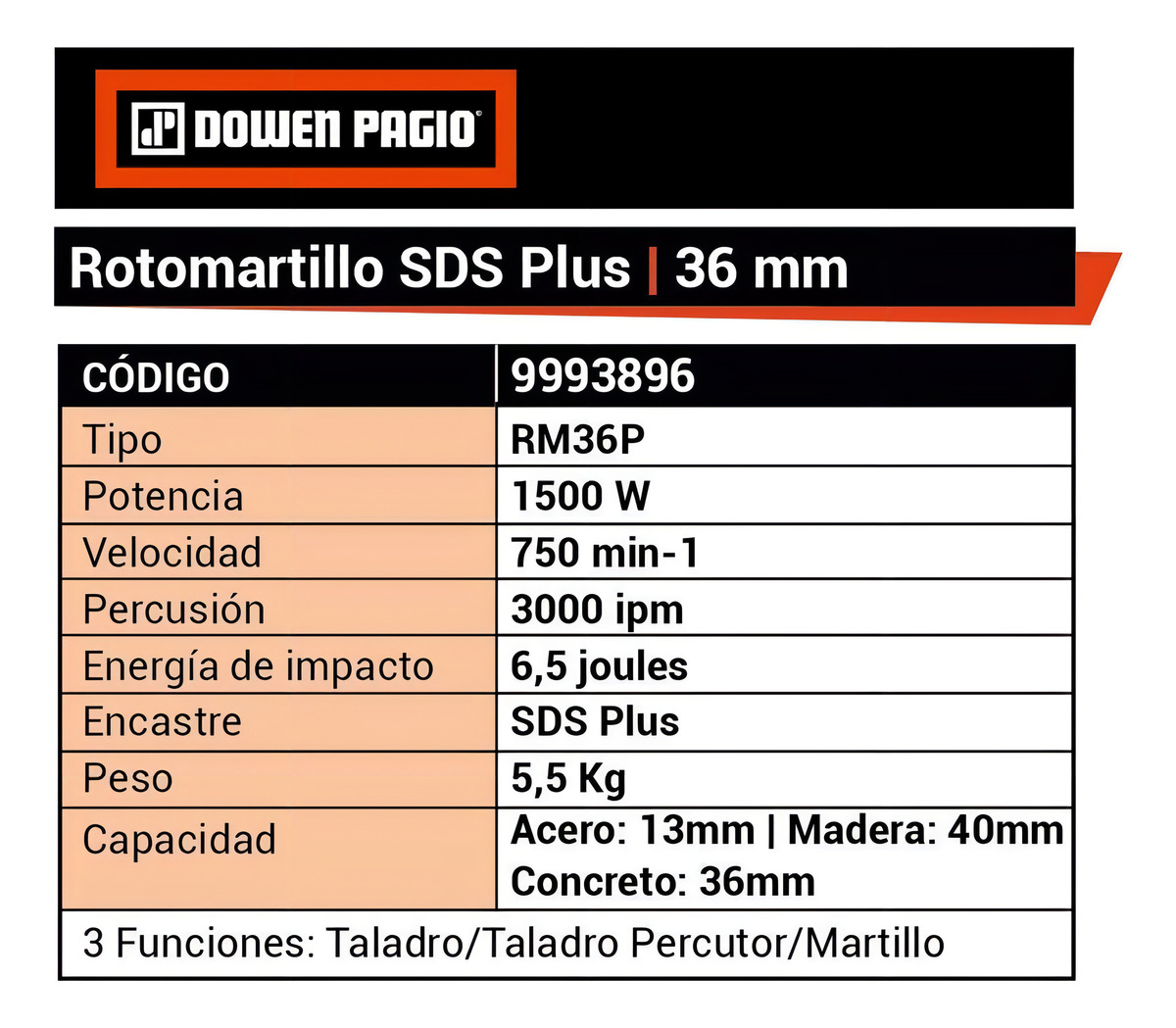 Rotomartillo Electroneumático Dowen Pagio Rm36p Naranja Con 1.5kw De Potencia