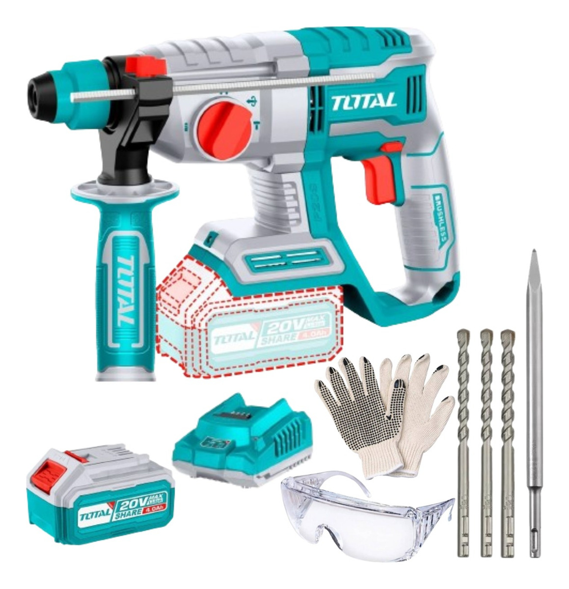 Incluye 1 baterĂa de Litio-Ion de 20v – 4.0Ah, Cargador rápido, 3 mechas SDS Plus (6, 8 y 10mm) y cincel punta.