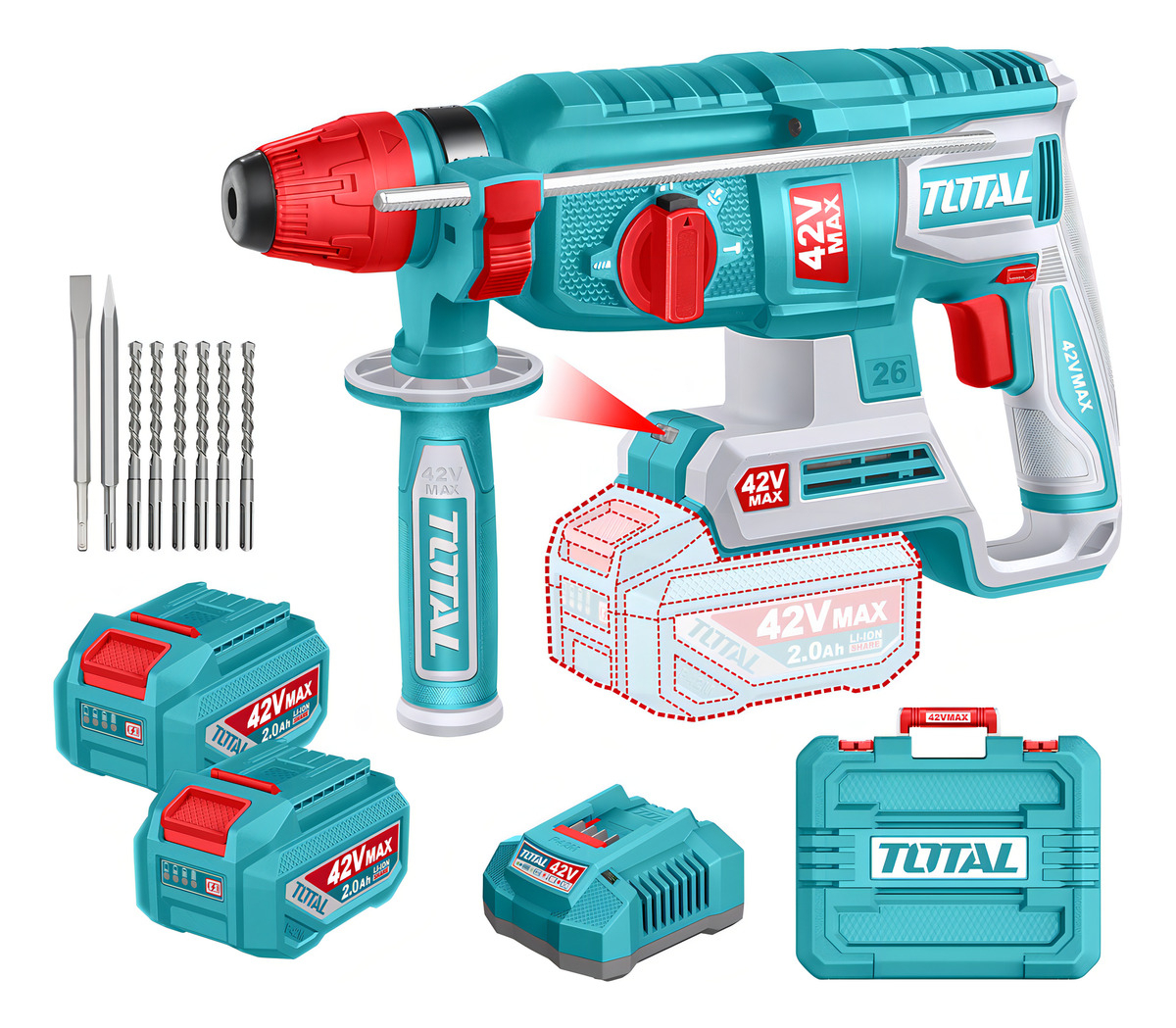 Rotomartillo Inalámbrico Total 42v – Motor Brushless, Sin Carbones – 2.5 J, Encastre Sds Plus – Con 2 Baterías 2.0ah Litio-ion, Cargador, 6 Mechas Y Maletín – Trhli422682 TurquesaUSD 251,8Transferencia & Abitab