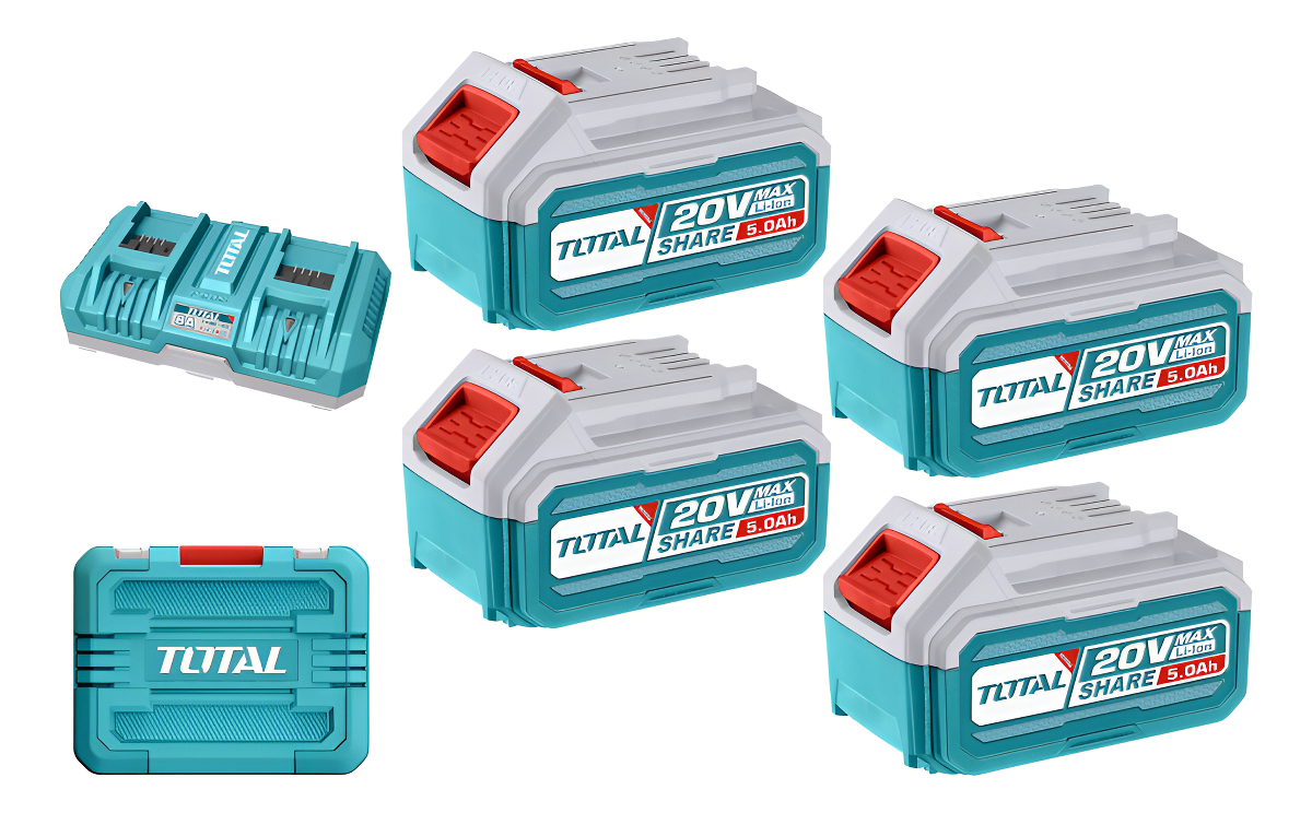Descubre el Set 20V Total, que incluye 4 baterĂas de alta capacidad de 5.0Ah y un cargador doble con un rendimiento excepcional. Diseñado especialmente para herramientas elĂ©ctricas de la marca Total 20V, este set es ideal para profesionales que exigen potencia y eficiencia en su trabajo. Su voltaje de 20V garantiza un funcionamiento Ă³ptimo, mientras que el indicador LED en las baterĂas permite supervisar el nivel de carga en todo momento, facilitando su gestiĂ³n. Con una corriente de carga de 4A para cada baterĂa, el cargador asegura que una baterĂa de 5.0Ah se carga completamente en aproximadamente 1 hora. El set tambiĂ©n incluye un prĂ¡ctico maletĂn plĂ¡stico para un fĂ¡cil transporte y almacenamiento, asegurando que tus herramientas y baterĂas estĂ©n siempre listas para usar. ¡Mejora tu productividad con el Set 20V Total!
