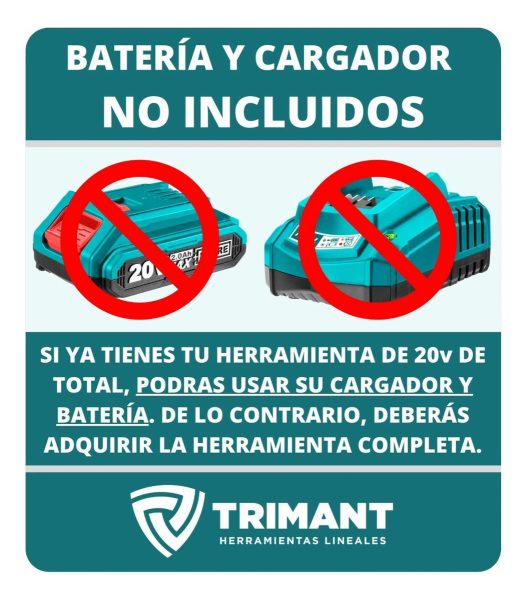 Esta herramienta funciona con baterĂas de 20v de Total.
