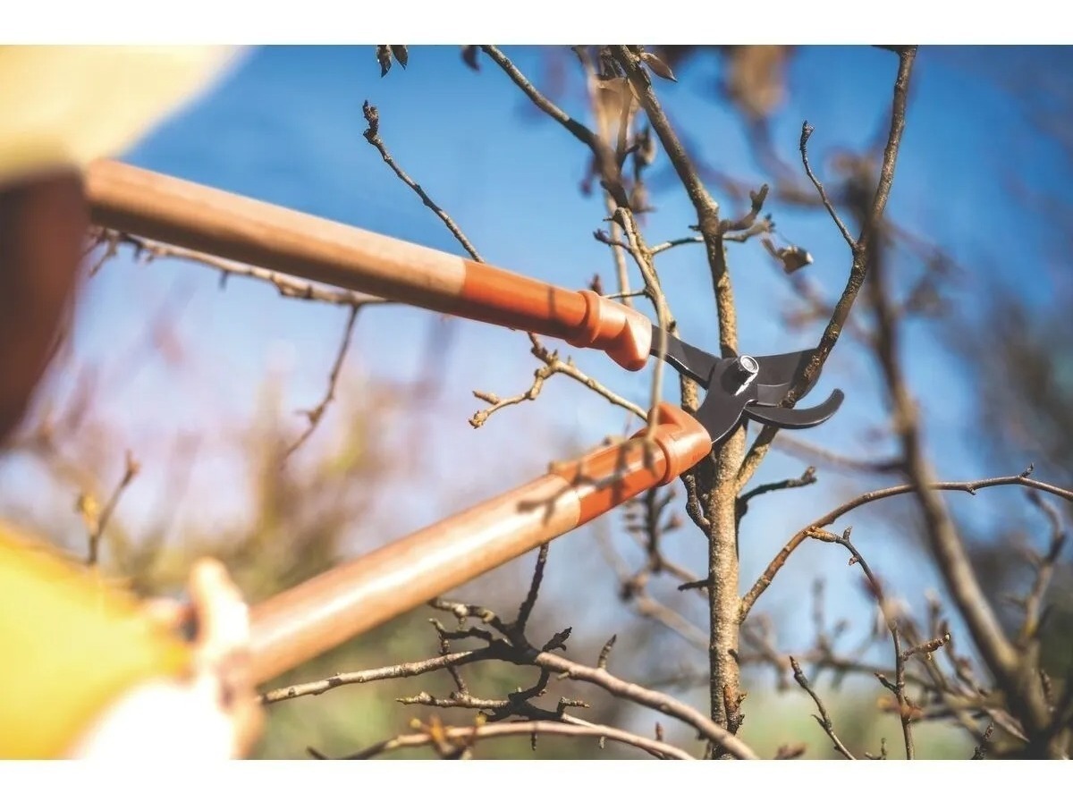 – La tijera es propia para podar gajos altos y ramas de árboles donde no es posible alcanzar con las tijeras normales (cortas).